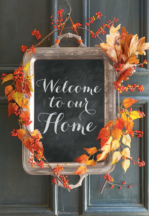 There’s comfort in the rituals: warm drinks, long walks, the scent of cinnamon and woodsmoke. And if you’re looking for a simple way to bring the season indoors, gather colourful leaves with the kids and make a leaf collage or garland. Just paper, glue, string and a little creativity turns a walk in the park into a memory on the wall. These small seasonal moments remind us that connection and creativity often live in the simplest acts.Greet Guests …with this charming alternative to a fall wreath.Simply apply a layer of chalkboard paint to the inside of an old tray, then add autumn leaves and bittersweet berries for a seasonal finish.Source: https://tinyurl.com/3m8ad7v4