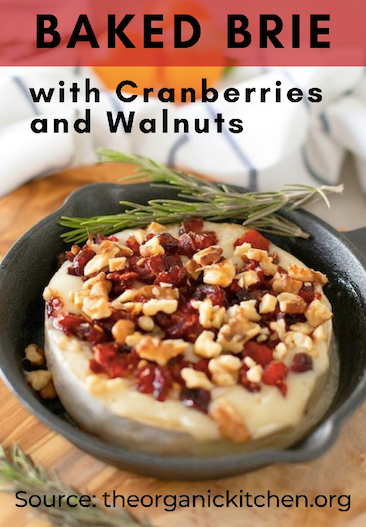 - Chop cranberries, place them in a small microwave safe bowl, add orange juice and stir well. Place in the microwave for 50 seconds, this softens them up. Pour berries over Brie and top with chopped walnuts.